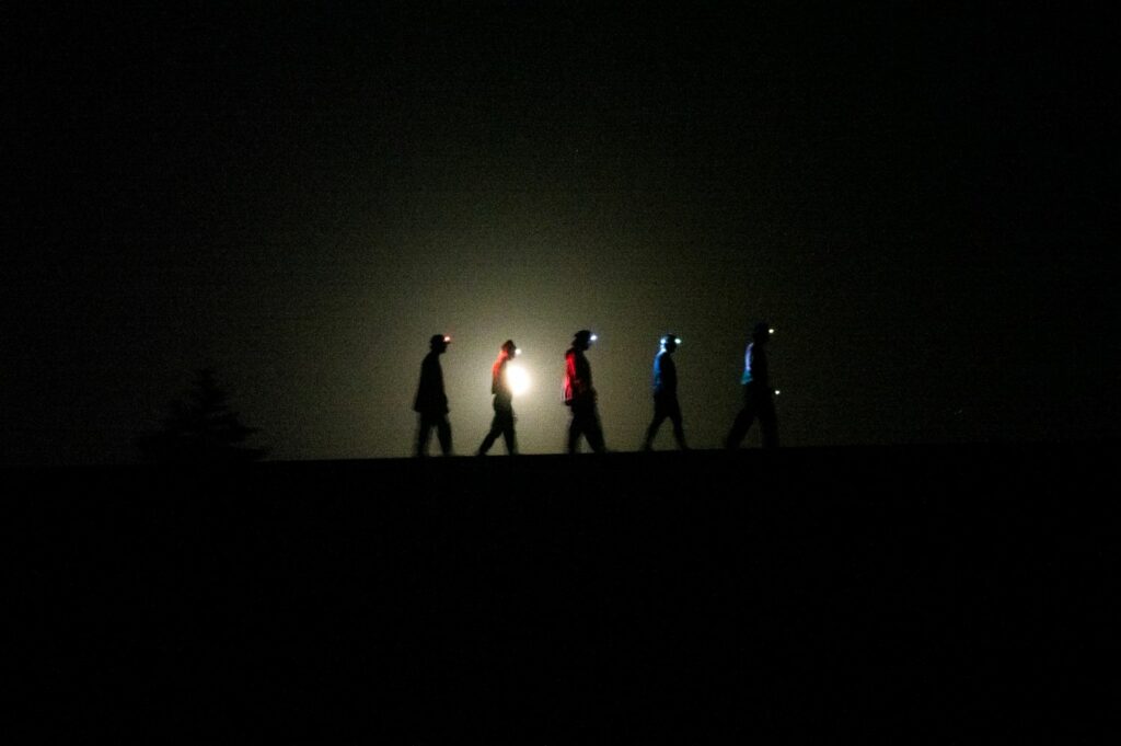La nuit est tombée, il fait noir, la trame musicale se fait sombre, métallique, percussive, tout est en place, comme prévu, pourtant plus rien n’est comme avant. La nuit tout change : on s’éclaire pour mieux voir, les halos des lampadaires deviennent les lieux de nos rendez-vous. On a une histoire d’aventure collective à raconter, elle a commencé il y a déjà de nombreuses années et c’est au public de trouver son chemin une fois la nuit tombée.